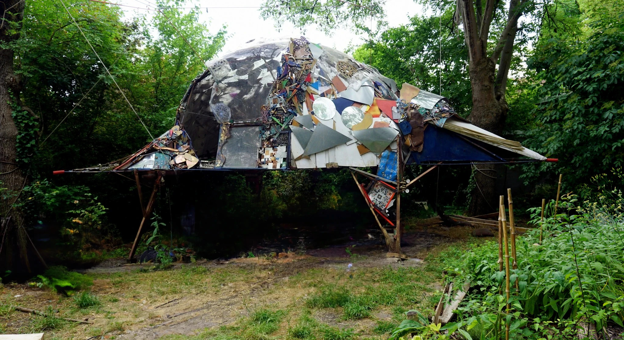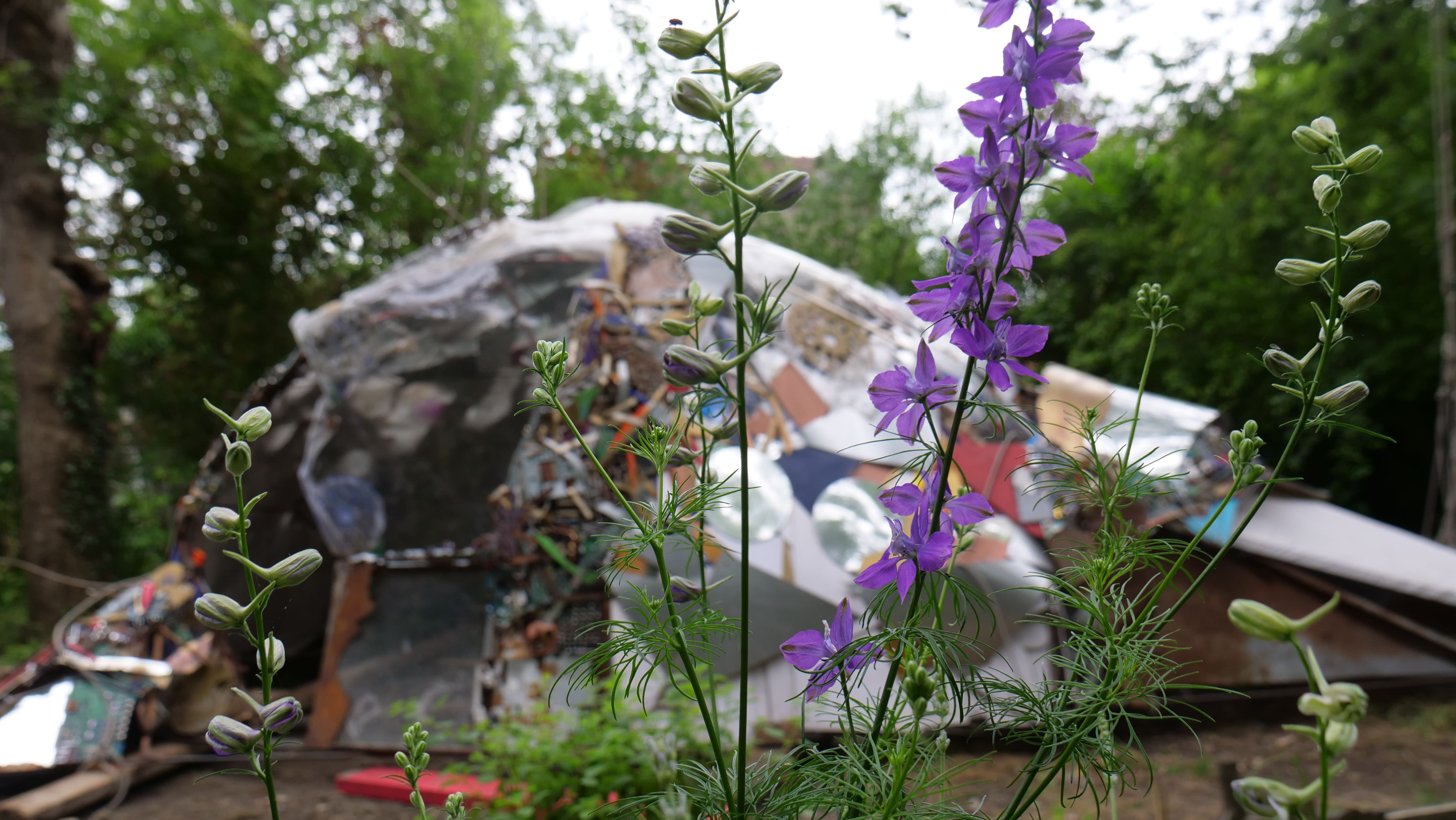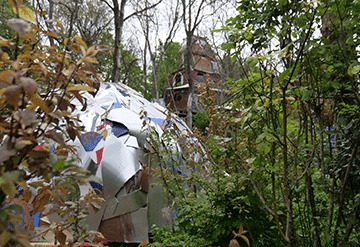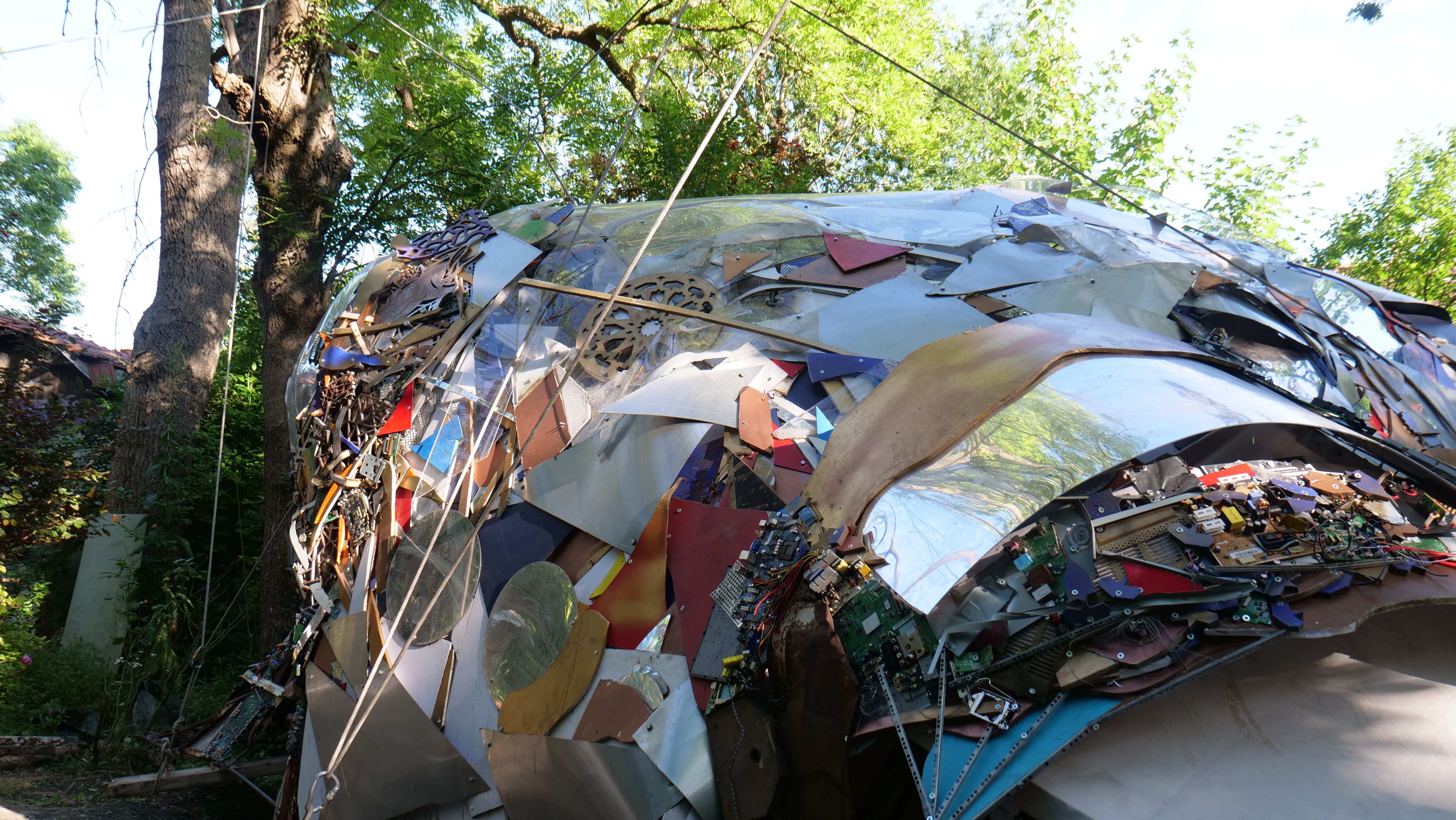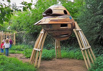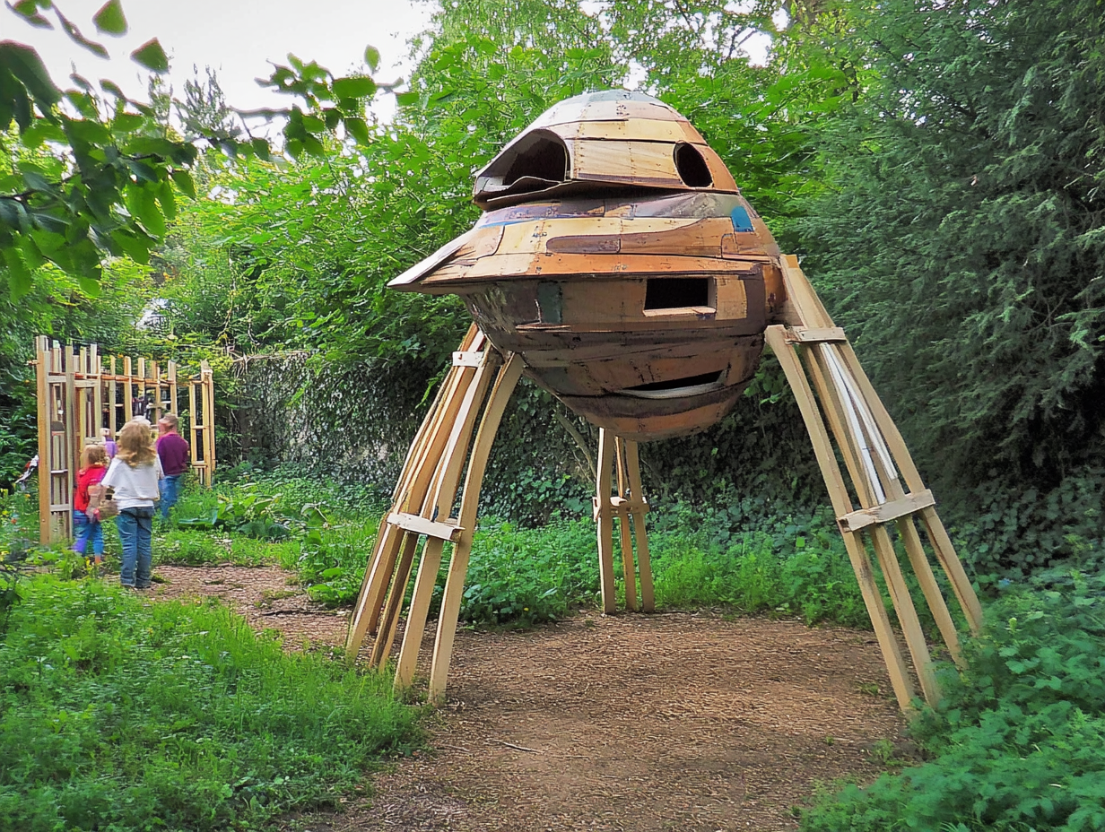 Emerging from the landscape, the monumental sculpture of a flying saucer